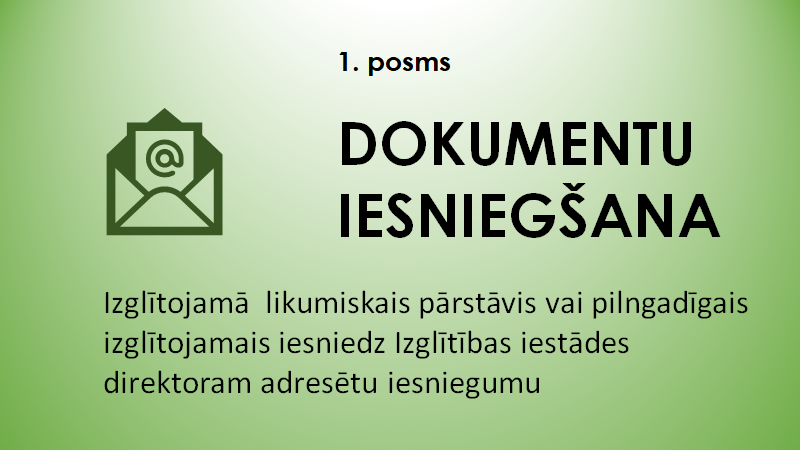 Lai pieteiktos mācībām skolā, izglītojamā vecāki/to likumīgie pārstāvji vai pilngadīgais izglītojamais iesniedz Skolas direktoram adresētu iesniegumu. Tam pievieno: