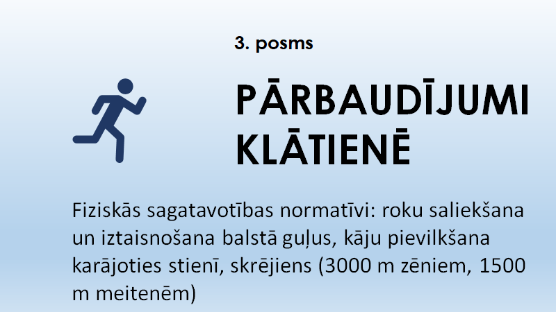 Iestājpārbaudījumi klātienē - fizisko normatīvu izpilde. Precīzu iestājpārbaudījumu norises laiku un vietu katram pretendentam paziņos telefoniski vai ar elektroniskā pasta starpniecību.