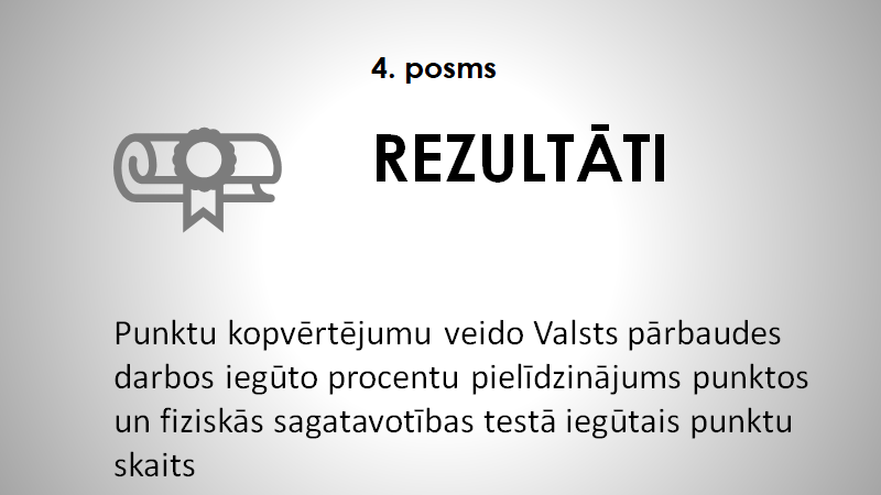 Fiziskās sagatavotības testi paredz roku saliekšanu un iztaisnošanu balstā guļus, kāju pievilkšanu karājoties stienī, skrējienu (3000m zēniem, 1500 meitenēm). Fizisko normatīvu izpildes vērtējuma tabula pieejama ŠEIT.