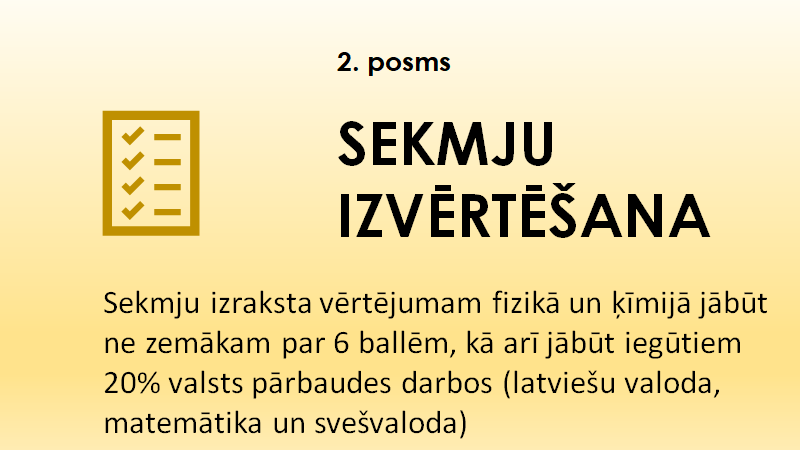 Pretendentam izvērtē gada vērtējums eksaktajos mācību priekšmetos - ķīmijā, fizikā (vismaz 6 balles), nokārtoti valsts pārbaudes darbi. Jābūt iegūtiem 20 % valsts pārbaudes darbos (svešvaloda, latviešu valoda, matemātika)